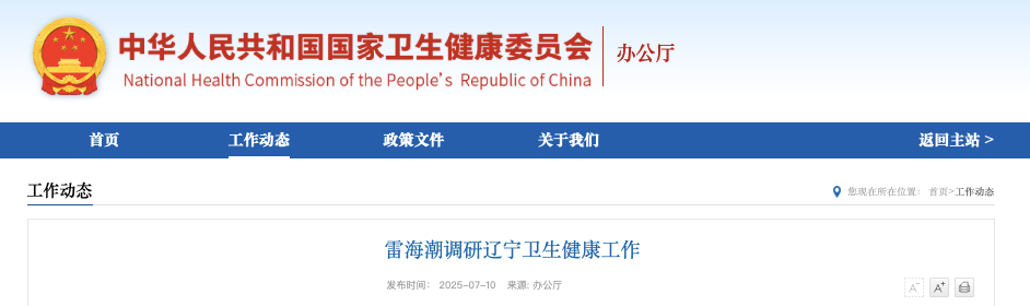 7月8日至9日,国家卫生健康委党组书记、主任雷海潮赴辽宁调研卫生健康工作,先后到沈阳市和阜新市,深入托育机构、医院、急救和精神卫生机构、社区卫生服务中心,与一线工作人员和群众交流,实地了解医疗卫生、托育服务等工作情况。调研期间,辽宁省委书记、省人大常委会主任郝鹏,省委副书记、省长王新伟与雷海潮座谈。