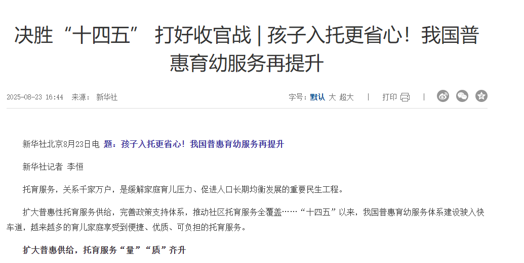 新华社北京8月23日电 题:孩子入托更省心!我国普惠育幼服务再提升 新华社记者 李恒 托育服务,关系千家万户,是缓解家庭育儿压力、促进人口长期均衡发展的重要民生工程。