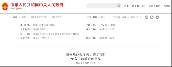 免除公办幼儿园学前1年保教费 国务院办公厅8月5日印发《关于逐步推行免费学前教育的意见》,明确从2025年秋季学期起,免除公办幼儿园学前一年在园儿童保育教育费,相应减免民办幼儿园保育教育费。